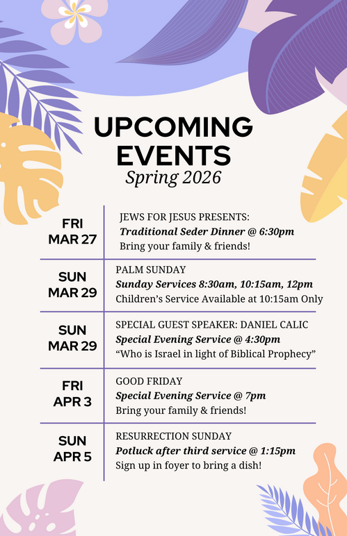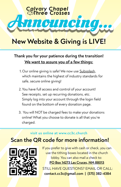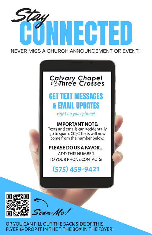 We will highlight special messages that we want to be sure you don't miss! Thank you for taking the time read our news and announcements. You are a vital member of the Body of Christ here at Calvary and we want you to stay informed of all the wonderful things the Lord is doing here at Calvary Chapel Three Crosses!
